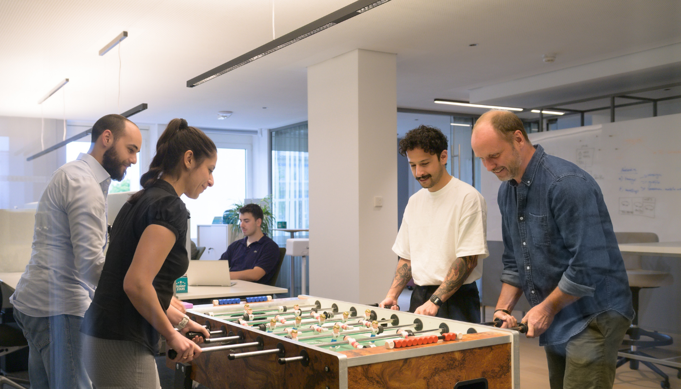 In der Pause treffen wir uns auch mal zum gemeinsamen Kochen in unserer toll ausgestatteten Küche. Hier findest du übrigens auch unsere „Vitamin-Tankstelle“, an der du mit kostenlosem Obst, Slow Juicer und Mixer wieder richtig auftanken kannst. Guter Kaffee gehört ebenfalls selbstverständlich zu unserer Grundausstattung. Und für die Denkpause zwischendurch haben wir auch einen Kicker.